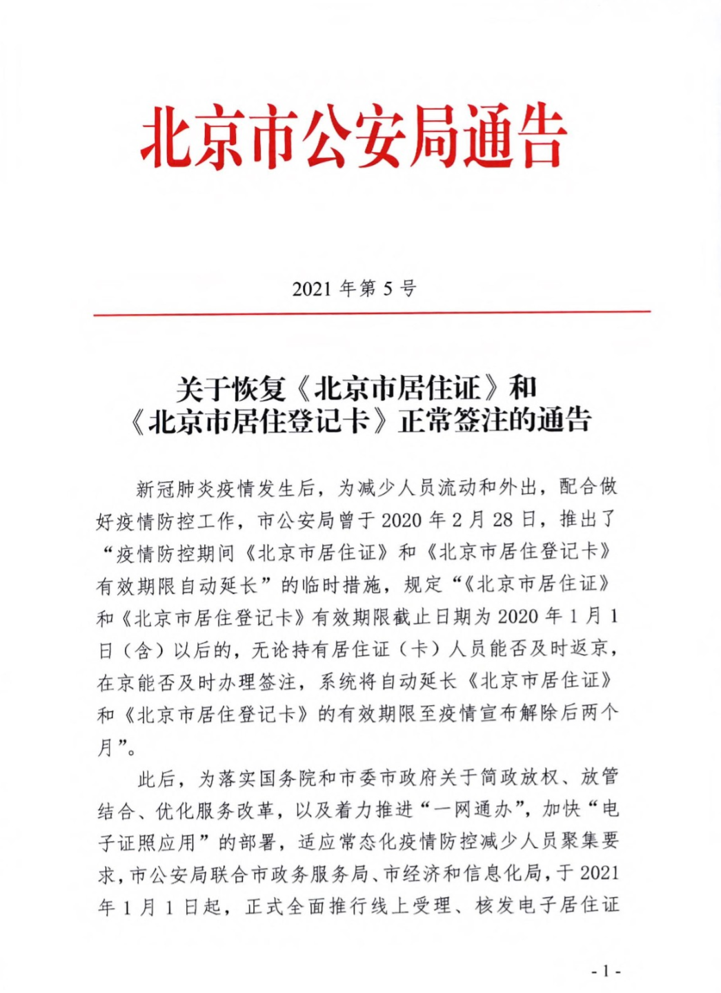 关于恢复《北京市居住证》 和《北京市居住登记卡》正常签注的通告